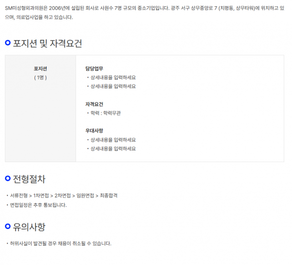 SM미성형외과 페이지 정보 작성자 관리자 작성일26-01-05 15:04 조회75회 댓글0건 이전글 다음글 목록 본문 회사명 SM미성형외과 지역 광주 서구 직군 정규직 연봉 25,156만이상 상태 진행중 내용 회사명: SM미성형외과 https://www.jobkorea.co.kr/Recruit/GI_Read/48060407?Oem_Code=C1&;logpath=1&stext=%EB%B3%91%EC%9B%90%EC%BD%94%EB%94%94%EB%84%A4%EC%9D%B4%ED%84%B0&listno=6&sc=630 근무처: 광주 서구시간: 주6일(월~금) 09:00~18:00월화수금:오전10시~오후7시,목오후2시~오후8시, 토:오전9시30분~오후1시직책: 정규마감일 :상시채용접수처: 잡코리아 이전글 다음글 목록